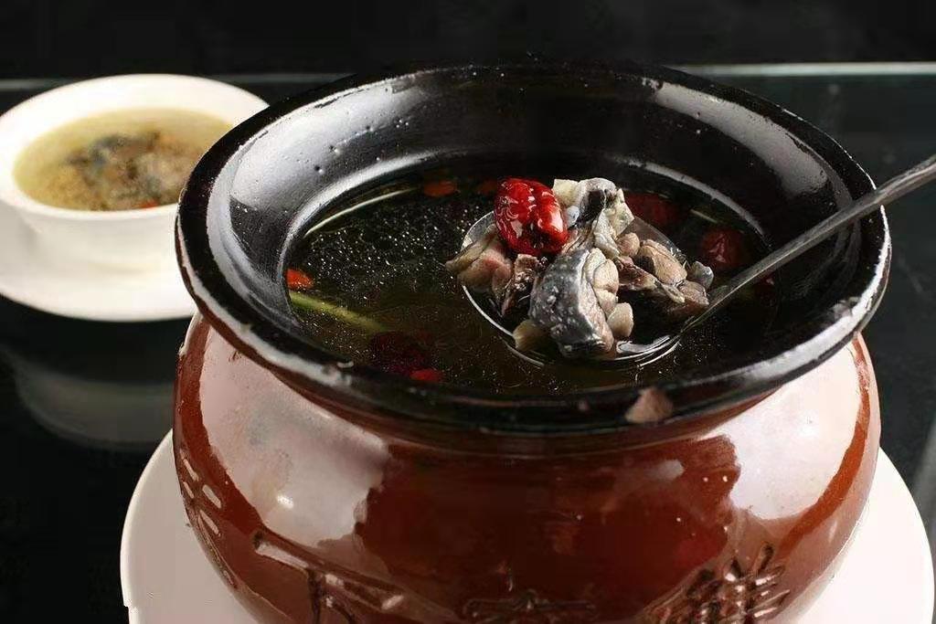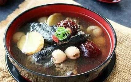 乌鸡汤是广东省传统的地方名菜,以乌鸡、阿胶、黄精、桂圆、红枣、枸杞等食材制作而成。乌鸡营养丰富,并含有激素和紫色素,对人体白血球和血色素有增强的作用。